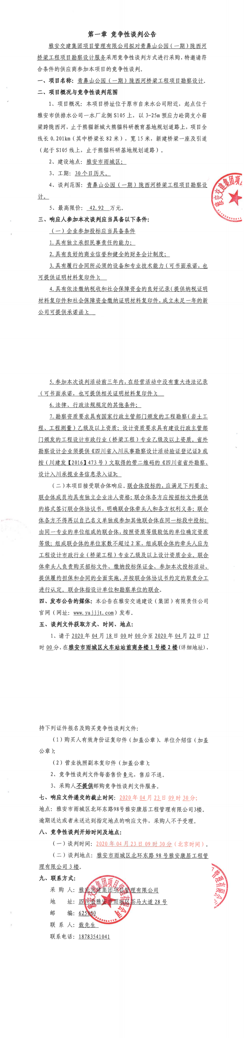 雅安交建集團項目管理有限公司青鼻山公園(一期)隴西河橋梁工程項目勘察設(shè)計競爭性談判公告