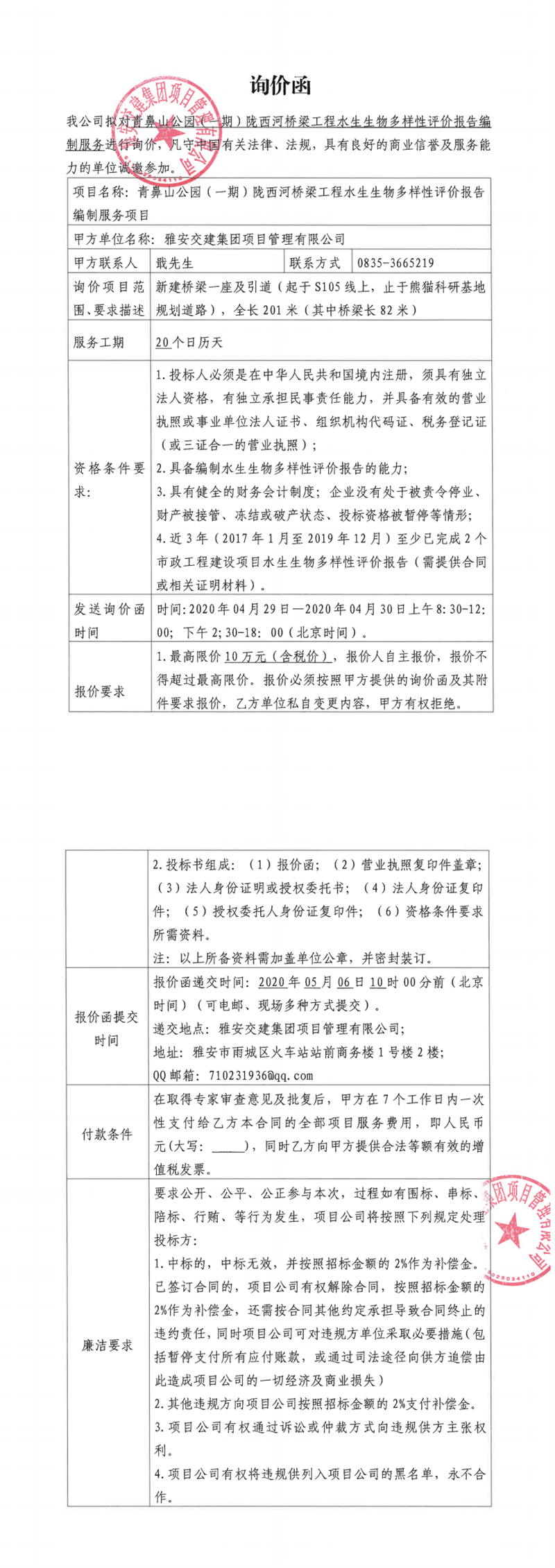 雅安交建集團(tuán)項(xiàng)目管理有限公司青鼻山公園(一期)隴西河橋梁工程水生生物多樣性評(píng)價(jià)報(bào)告編制服務(wù)項(xiàng)目詢價(jià)函