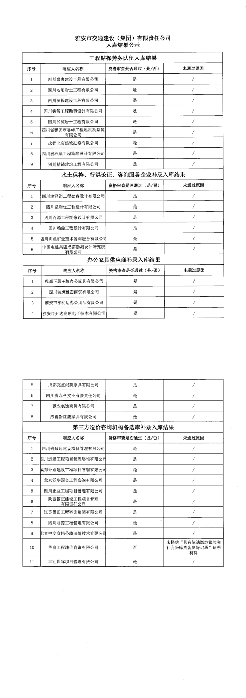 雅安市交通建設(shè)(集團)有限責任公司入庫結(jié)果公示
