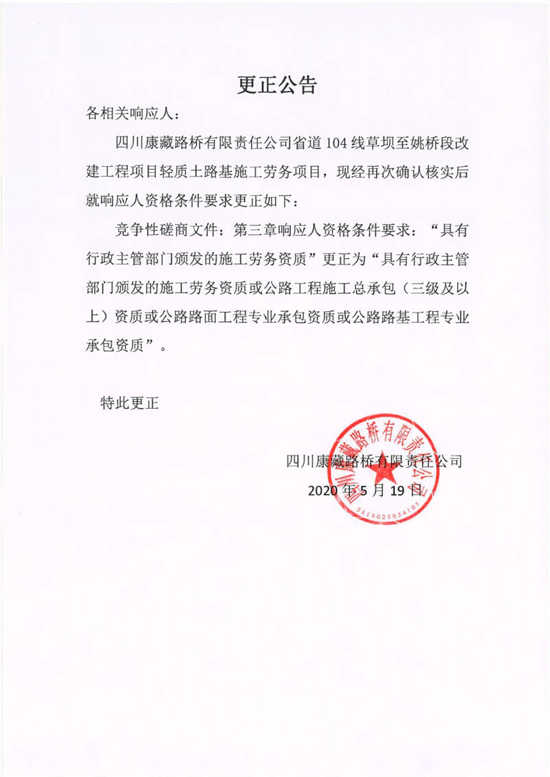 四川康藏路橋有限責任公司省道104線草壩至姚橋段改建工程項目輕質(zhì)土路基施工勞務(wù)項目更正公告