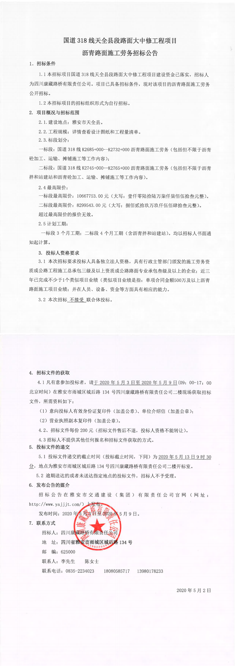 四川康藏路橋有限責(zé)任公司國(guó)道318線天全縣段路面大中修工程項(xiàng)目瀝青路面施工勞務(wù)招標(biāo)公告