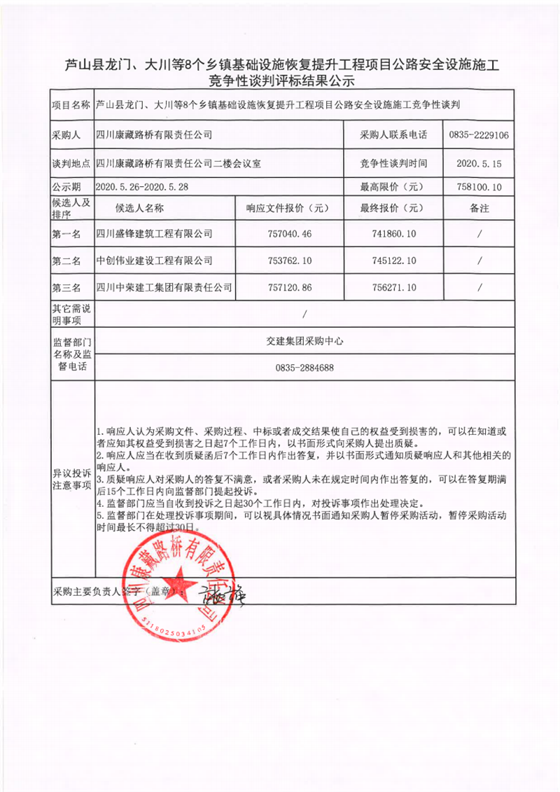 四川康藏路橋有限責(zé)任公司蘆山縣龍門、大川等8個鄉(xiāng)鎮(zhèn)基礎(chǔ)設(shè)施恢復(fù)提升工程項(xiàng)目公路安全設(shè)施施工競爭性談判評標(biāo)結(jié)果公示