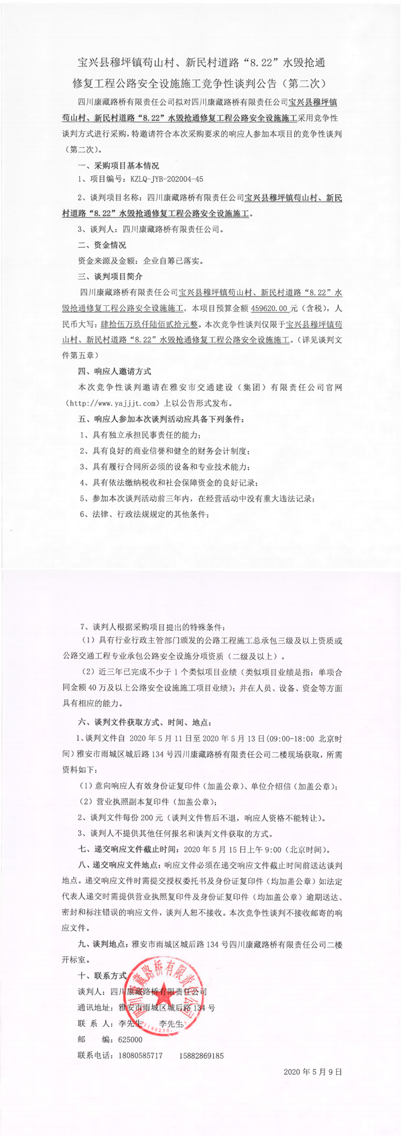四川康藏路橋有限責(zé)任公司寶興縣穆坪鎮(zhèn)茍山村、新民村道路“8.22”水毀搶通修復(fù)工程公路安全設(shè)施施工競爭性談判公告(第二次)