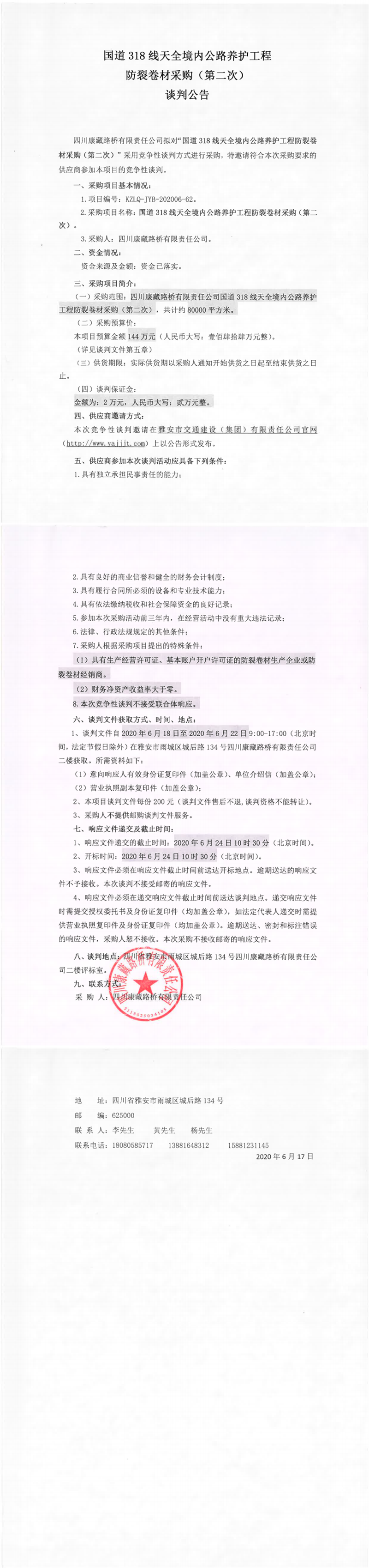 四川康藏路橋有限責(zé)任公司國(guó)道318線天全境內(nèi)公路養(yǎng)護(hù)工程防裂卷材采購(gòu)(第二次)談判公告