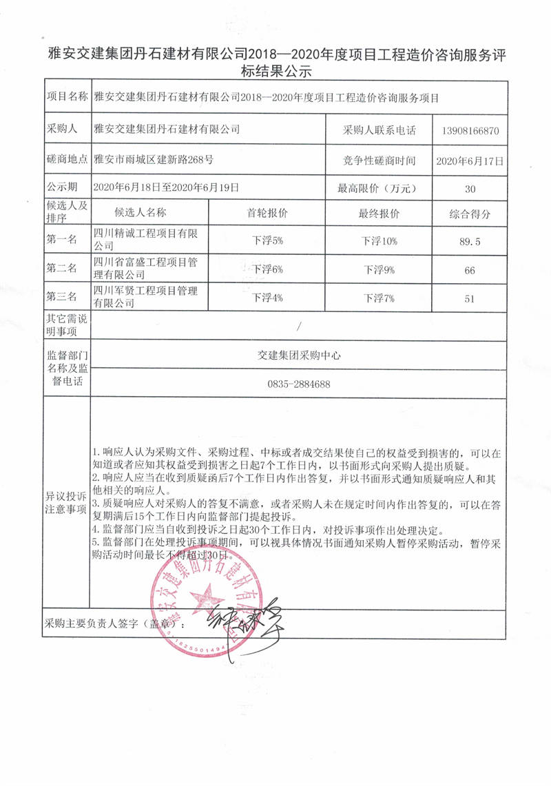 雅安交建集團(tuán)丹石建材有限公司2018—2020年度項(xiàng)目工程造價(jià)咨詢(xún)服務(wù)評(píng)標(biāo)結(jié)果公示