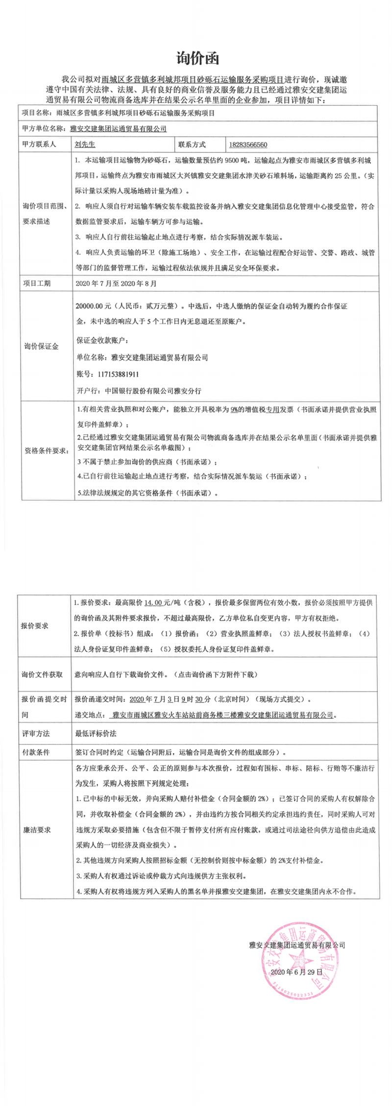 雅安交建集團(tuán)運(yùn)通貿(mào)易有限公司雨城區(qū)多營(yíng)鎮(zhèn)多利城邦項(xiàng)目砂礫石運(yùn)輸服務(wù)采購項(xiàng)目詢價(jià)函