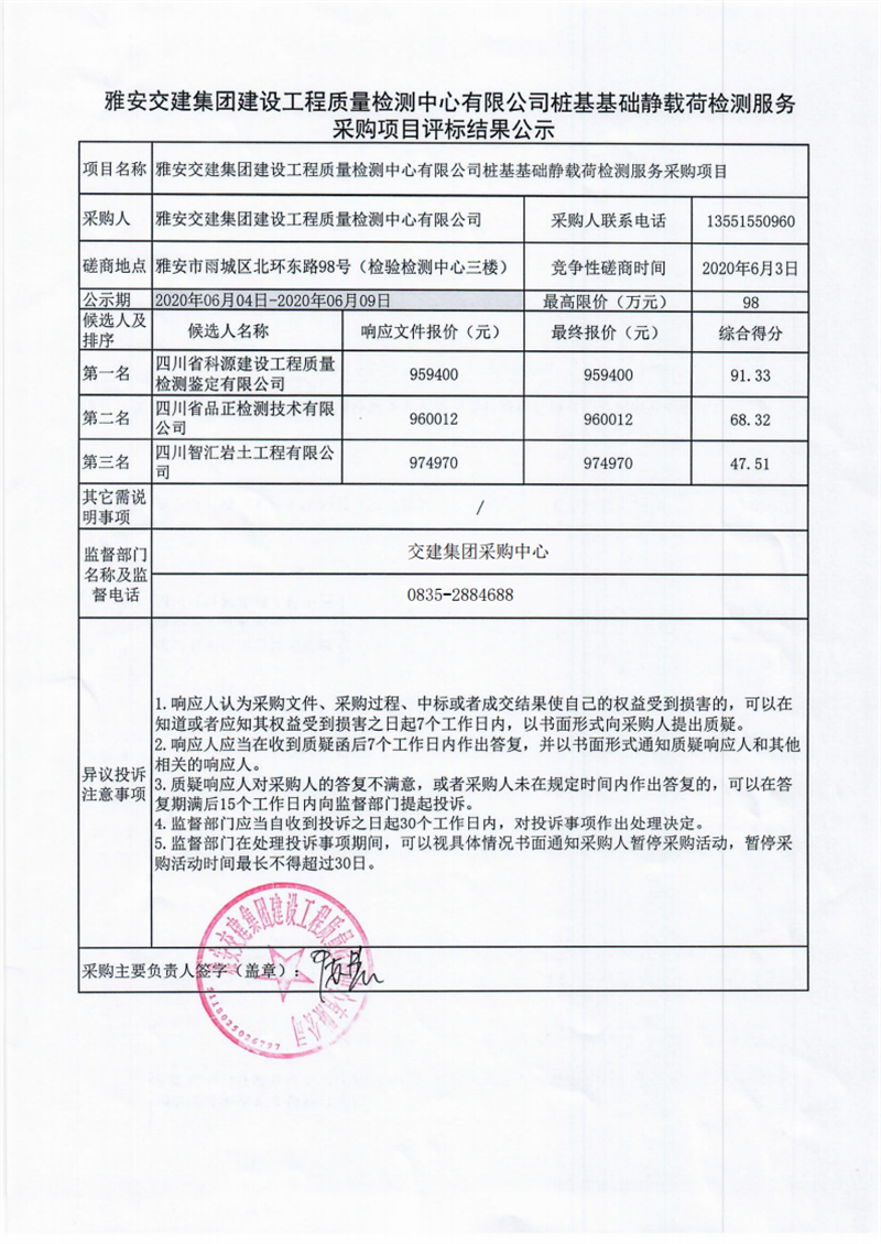 雅安交建集團(tuán)建設(shè)工程質(zhì)量檢測中心有限公司樁基基礎(chǔ)靜載荷檢測服務(wù)采購項(xiàng)目評標(biāo)結(jié)果公示