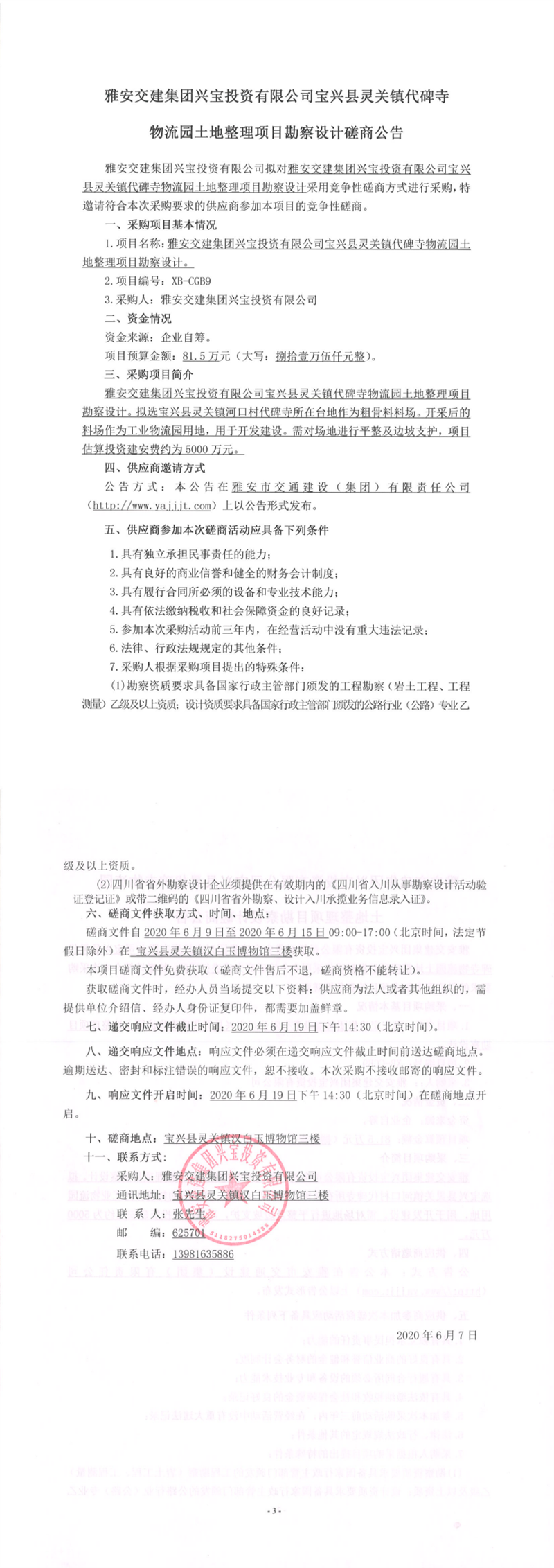 雅安交建集團(tuán)興寶投資有限公司寶興縣靈關(guān)鎮(zhèn)代碑寺物流園土地整理項(xiàng)目勘察設(shè)計(jì)競(jìng)爭(zhēng)性磋商公告