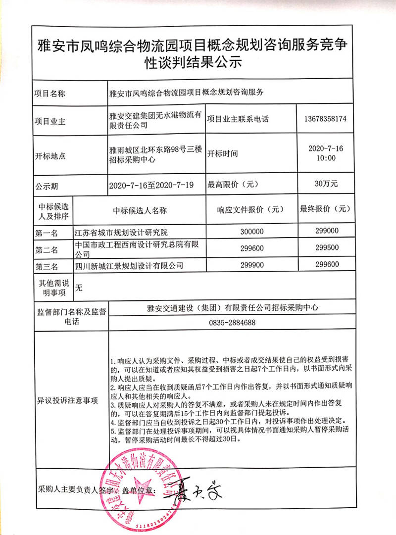 雅安交建集團無水港物流有限責任公司雅安市鳳鳴綜合物流園項目概念規(guī)劃咨詢服務競爭性談判結(jié)果公示