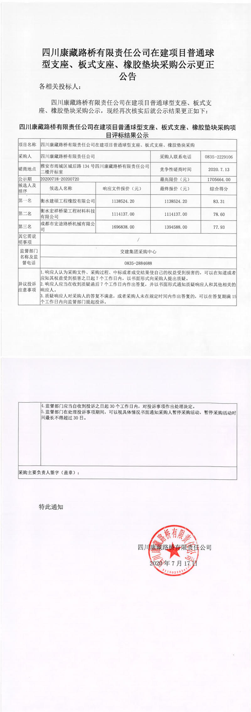 四川康藏路橋有限責(zé)任公司在建項目普通球型支座、板式支座、橡膠墊塊采購公示更正公告