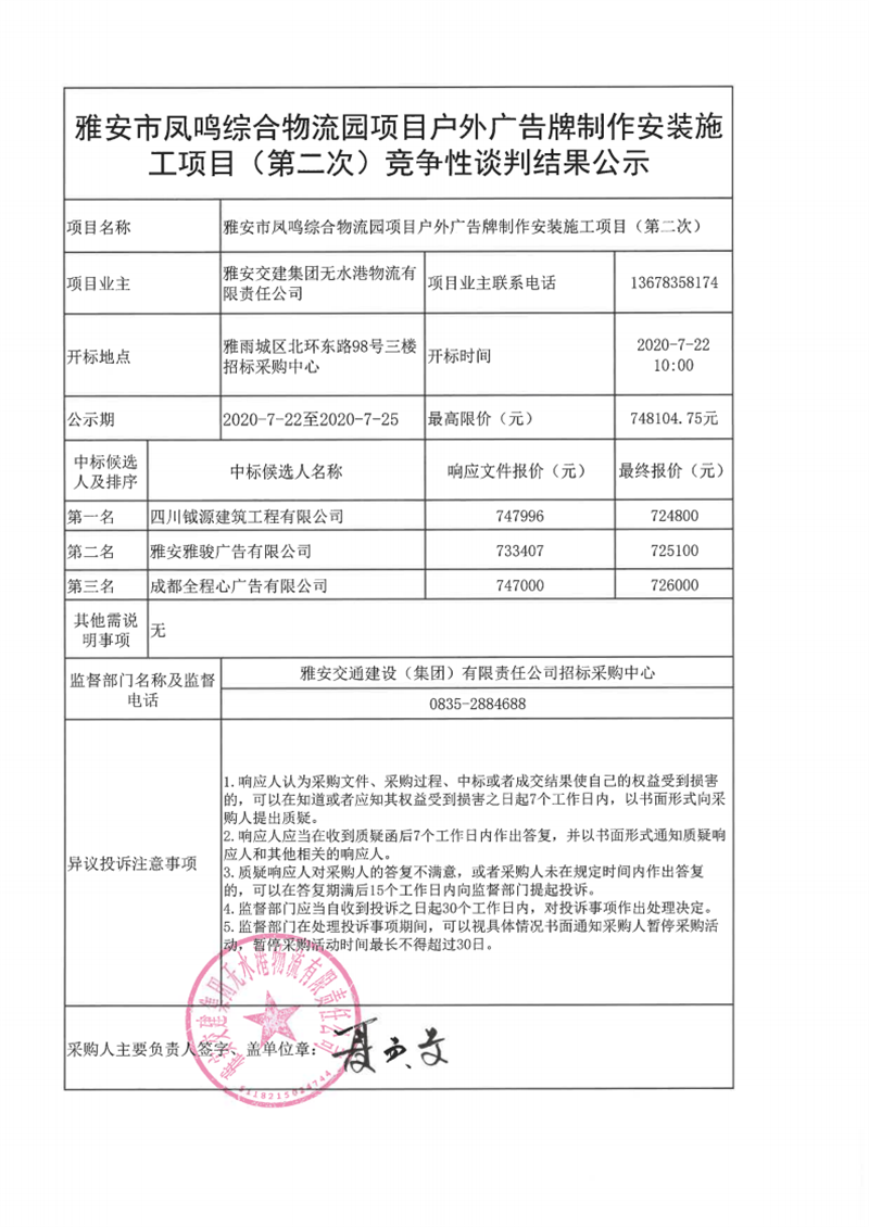 雅安交建集團(tuán)無水港物流有限責(zé)任公司雅安市鳳鳴綜合物流園項(xiàng)目戶外廣告牌制作安裝施工項(xiàng)目(第二次)競(jìng)爭(zhēng)性談判結(jié)果公示