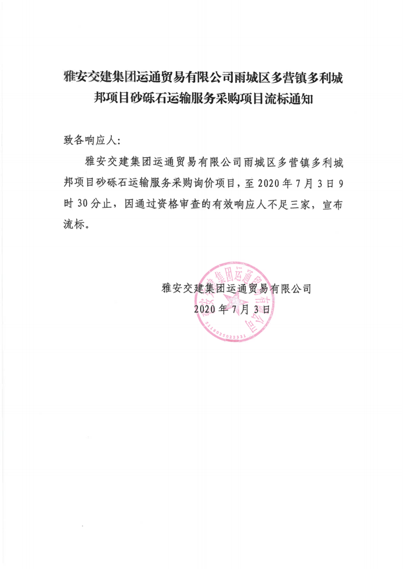 雅安交建集團(tuán)運(yùn)通貿(mào)易有限公司雨城區(qū)多營鎮(zhèn)多利城邦項(xiàng)目砂礫石運(yùn)輸服務(wù)采購項(xiàng)目流標(biāo)通知