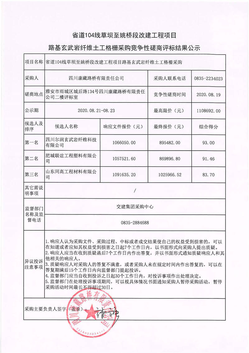 四川康藏路橋有限責(zé)任公司省道104線草壩至姚橋段改建工程項(xiàng)目路基玄武巖纖維土工格柵采購(gòu)競(jìng)爭(zhēng)性磋商評(píng)標(biāo)結(jié)果公示