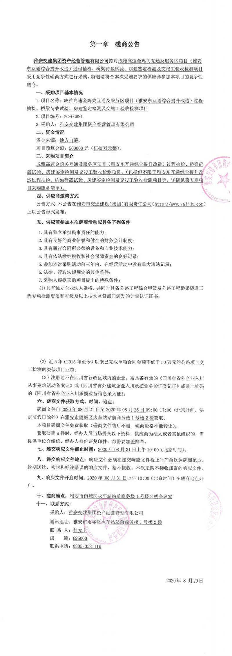雅安交建集團(tuán)資產(chǎn)經(jīng)營管理有限公司成雅高速金雞關(guān)互通及服務(wù)區(qū)項(xiàng)目(雅安東互通綜合提升改造)過程抽檢、橋梁荷載試驗(yàn)、房建鑒定檢測及交竣工驗(yàn)收檢測項(xiàng)目磋商公告