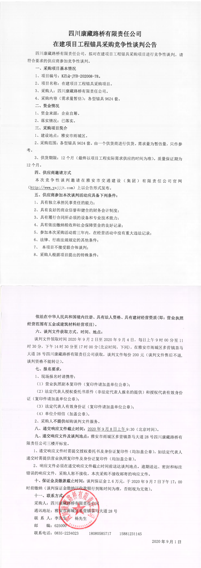 四川康藏路橋有限責(zé)任公司在建項(xiàng)目工程錨具采購競爭性談判公告