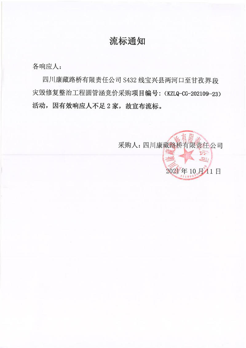 四川康藏路橋有限責任公司S432線寶興縣兩河口至甘孜界段災毀修復整治工程圓管涵采購競價流標通知