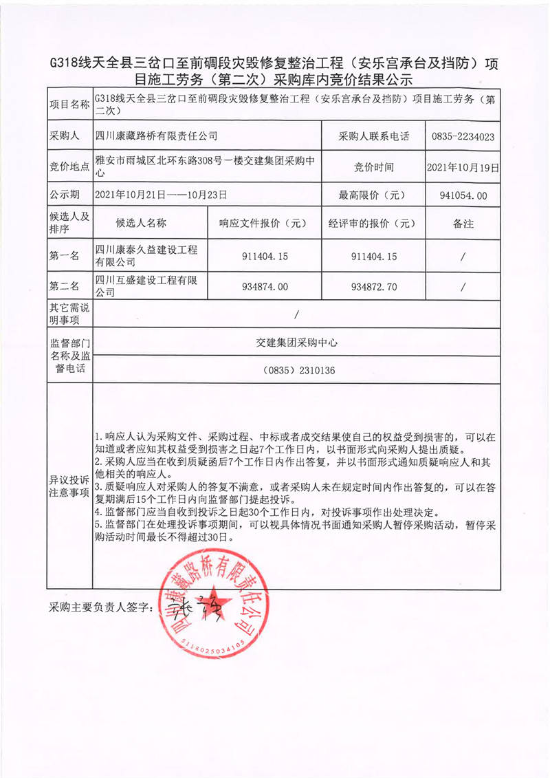 四川康藏路橋有限責(zé)任公司G318線天全縣三岔口至前碉段災(zāi)毀修復(fù)整治工程(安樂宮承臺(tái)及擋防)項(xiàng)目施工勞務(wù)(第二次)采購庫內(nèi)競(jìng)價(jià)結(jié)果公示