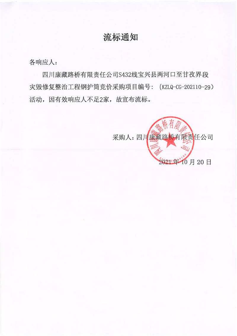 四川康藏路橋有限責(zé)任公司S432線寶興縣兩河口至甘孜界段災(zāi)毀修復(fù)整治工程鋼護(hù)筒競價(jià)采購流標(biāo)通知