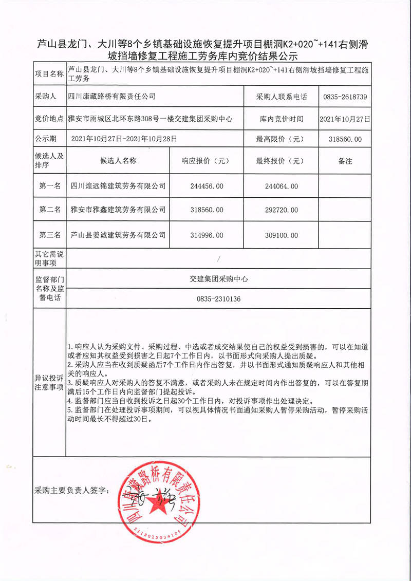 四川康藏路橋有限責(zé)任公司蘆山縣龍門、大川等8個鄉(xiāng)鎮(zhèn)基礎(chǔ)設(shè)施恢復(fù)提升項目棚洞K2+020~+141右側(cè)滑坡?lián)鯄π迯?fù)工程施工勞務(wù)庫內(nèi)競價結(jié)果公示