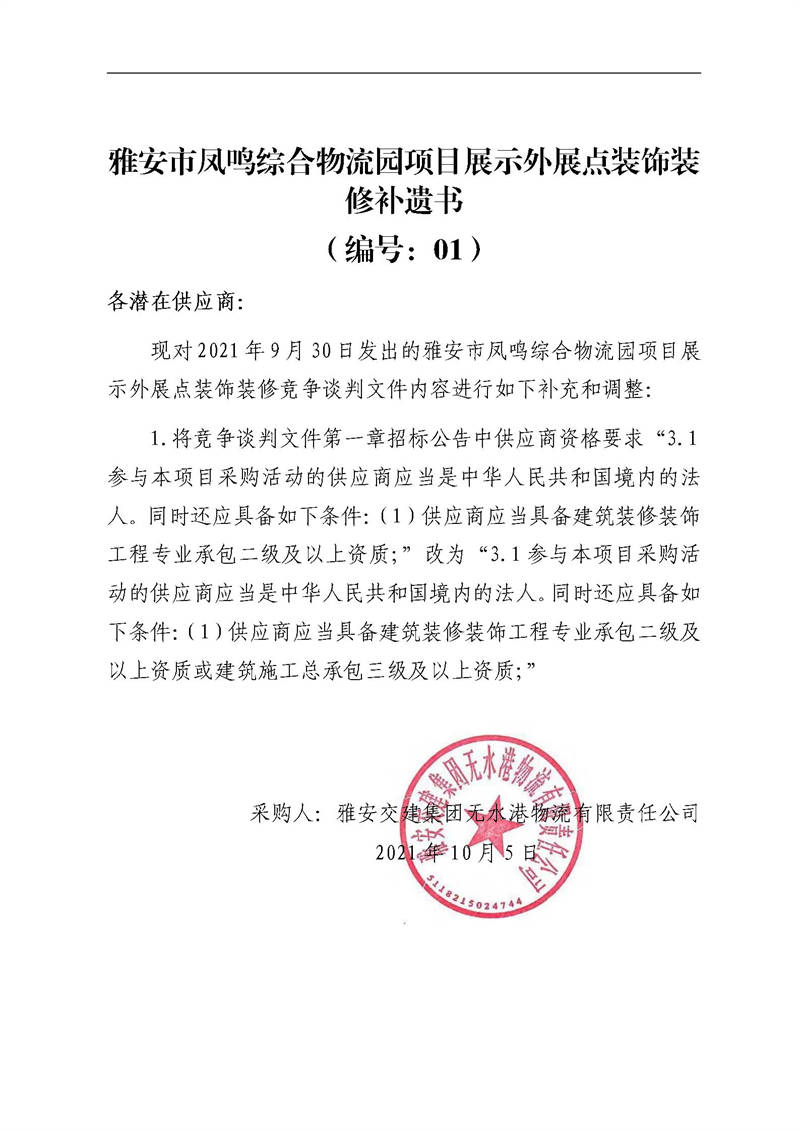 雅安交建集團(tuán)無水港物流有限責(zé)任公司雅安市鳳鳴綜合物流園項(xiàng)目展示外展點(diǎn)裝飾裝修補(bǔ)遺書