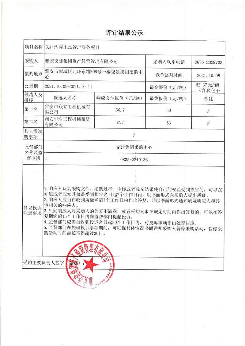 雅安交建集團(tuán)資產(chǎn)經(jīng)營管理有限公司關(guān)材溝棄土場管理服務(wù)項(xiàng)目評(píng)審結(jié)果公示