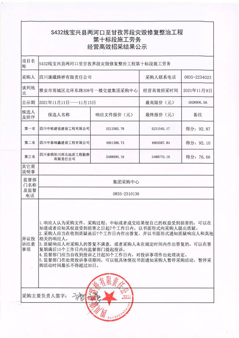 四川康藏路橋有限責任公司S432線寶興縣兩河口至甘孜界段災(zāi)毀修復整治工程第十標段施工勞務(wù)經(jīng)營高效招采結(jié)果公示