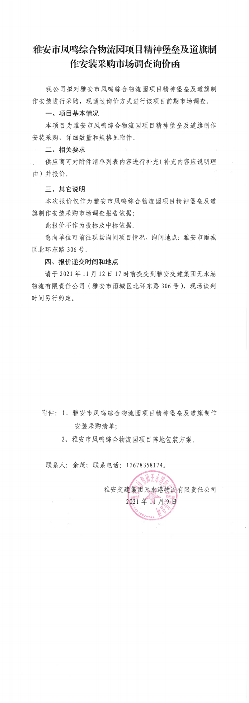 雅安交建集團無水港物流有限責(zé)任公司雅安市鳳鳴綜合物流園項目精神堡壘及道旗制作安裝采購市場調(diào)查詢價函