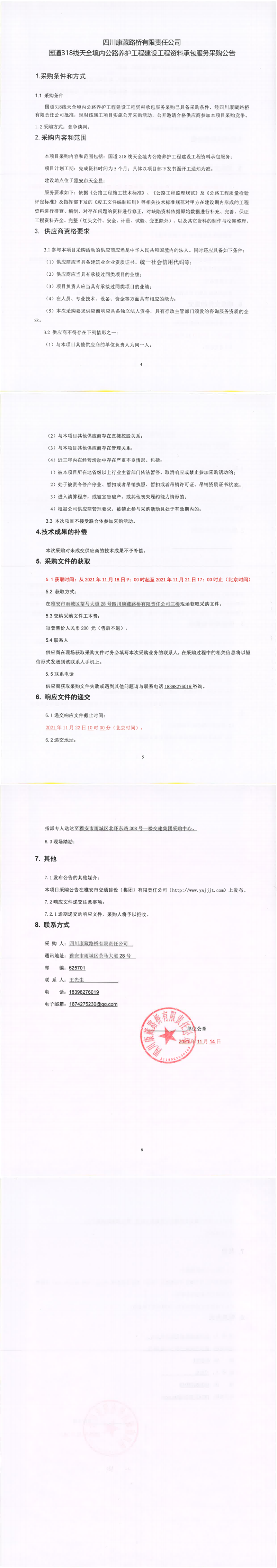 四川康藏路橋有限責(zé)任公司國道318線天全境內(nèi)公路養(yǎng)護工程建設(shè)工程資料承包服務(wù)采購公告