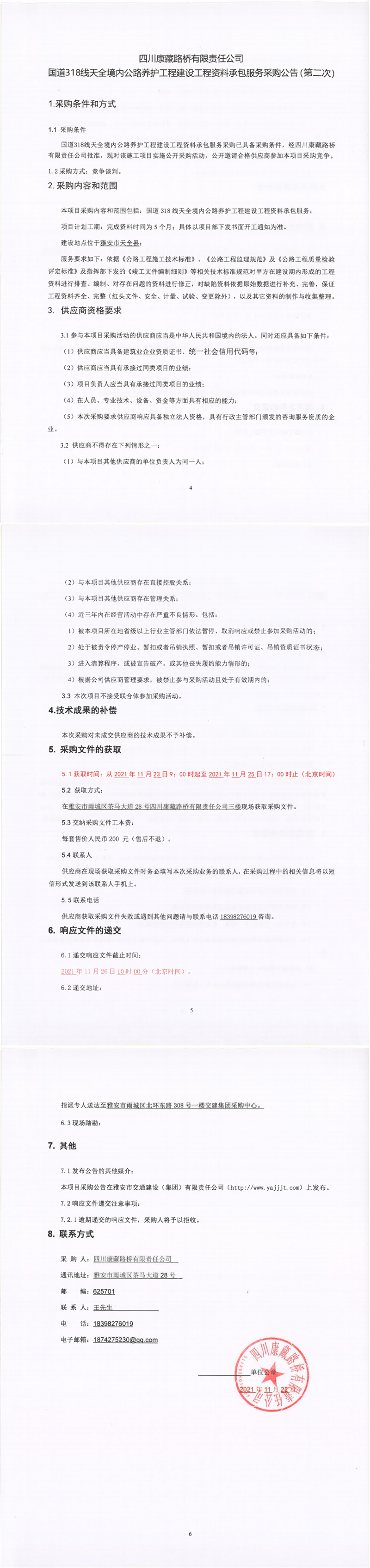 四川康藏路橋有限責(zé)任公司國道318線天全境內(nèi)公路養(yǎng)護(hù)工程建設(shè)工程資料承包服務(wù)采購公告(第二次)