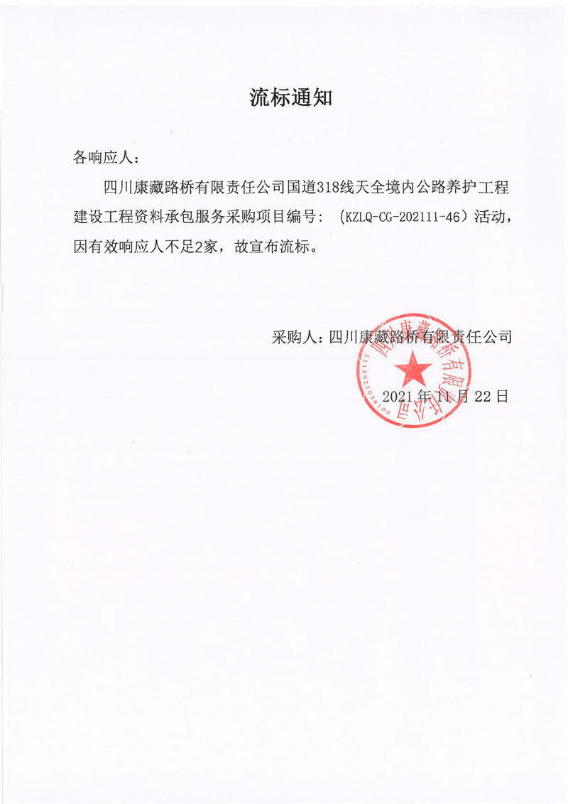 四川康藏路橋有限責(zé)任公司國道318線天全境內(nèi)公路養(yǎng)護工程建設(shè)工程資料承包服務(wù)采購流標(biāo)通知