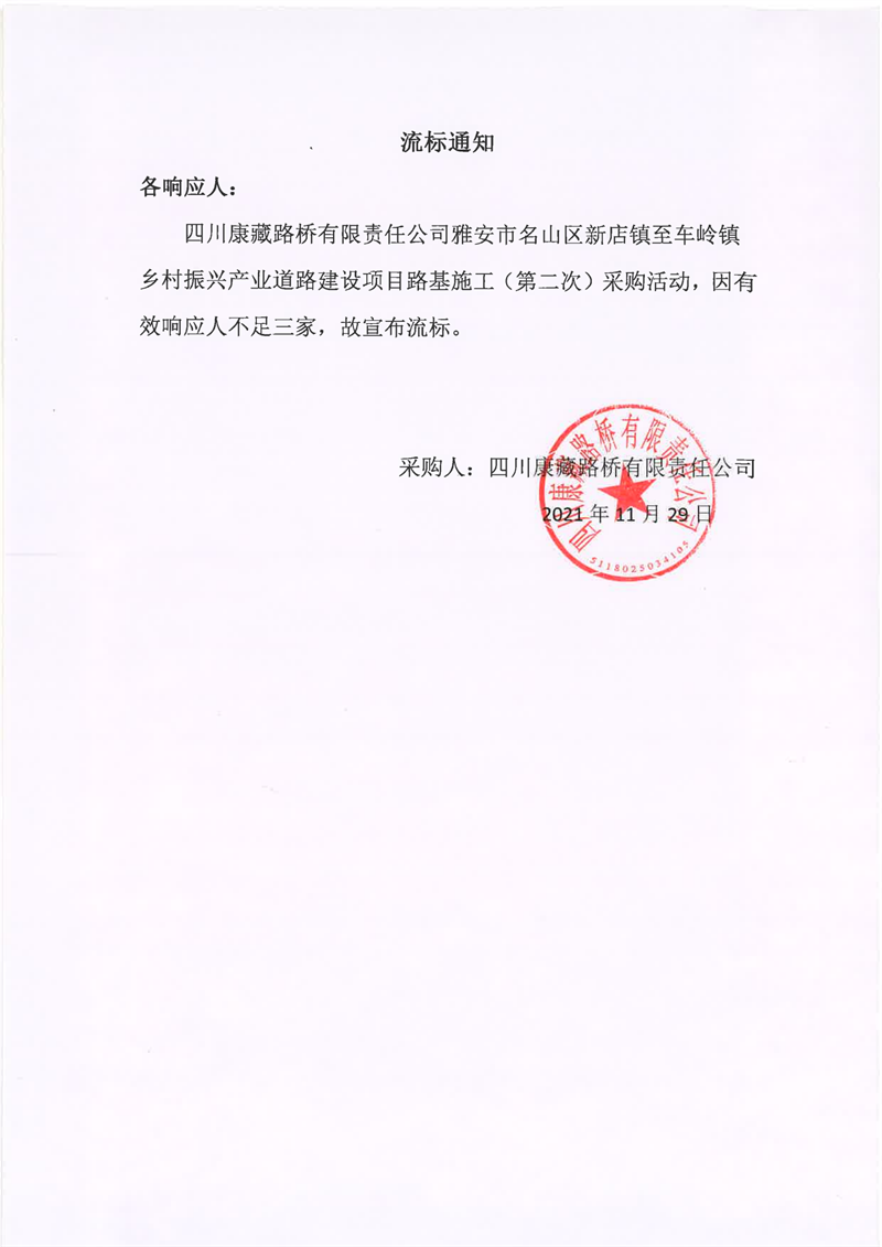 四川康藏路橋有限責任公司雅安市名山區(qū)新店鎮(zhèn)至車嶺鎮(zhèn)鄉(xiāng)村振興產(chǎn)業(yè)道路建設項目路面施工(第二次)流標通知