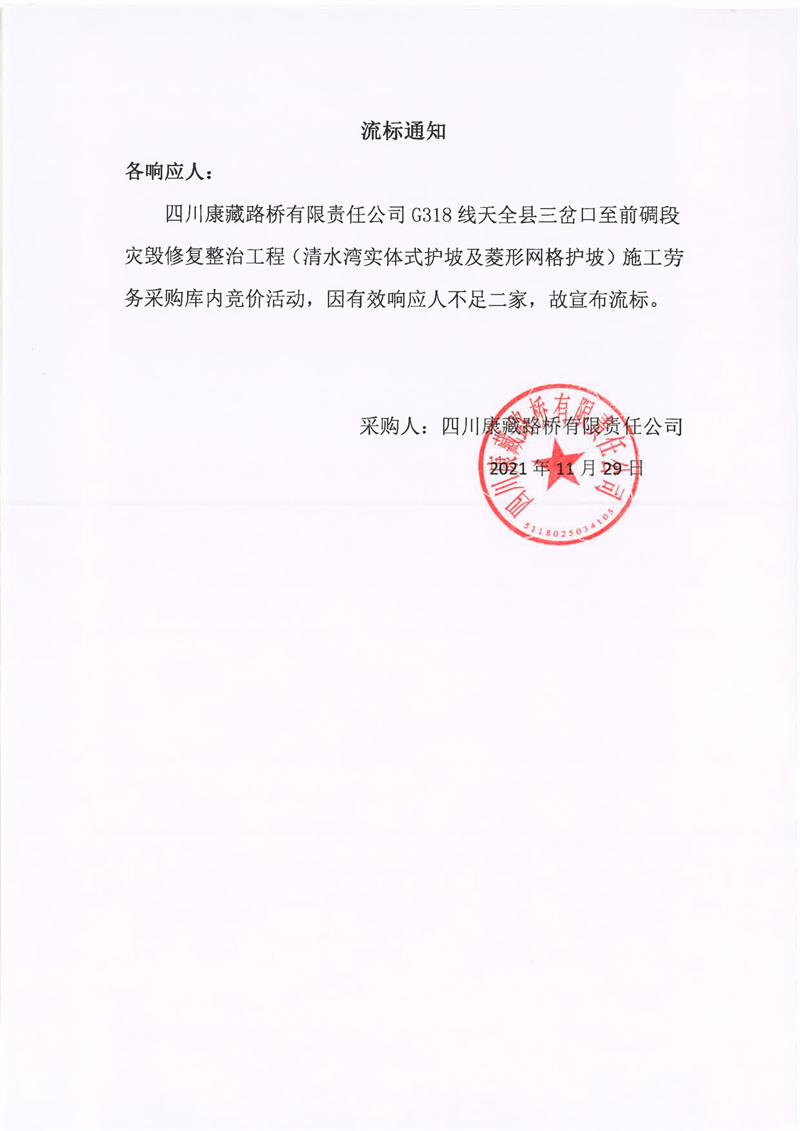 四川康藏路橋有限責(zé)任公司G318線天全縣三岔口至前碉段災(zāi)毀修復(fù)整治工程(清水灣實(shí)體式護(hù)坡及菱形網(wǎng)格護(hù)坡)施工勞務(wù)采購(gòu)流標(biāo)通知