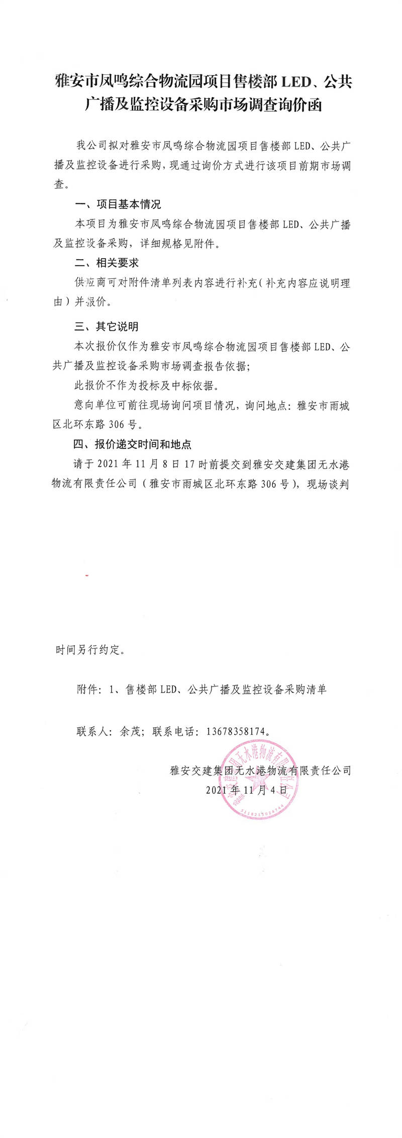 雅安交建集團無水港物流有限責任公司雅安市鳳鳴綜合物流園項目售樓部LED、公共廣播及監(jiān)控設備采購市場調(diào)查詢價函