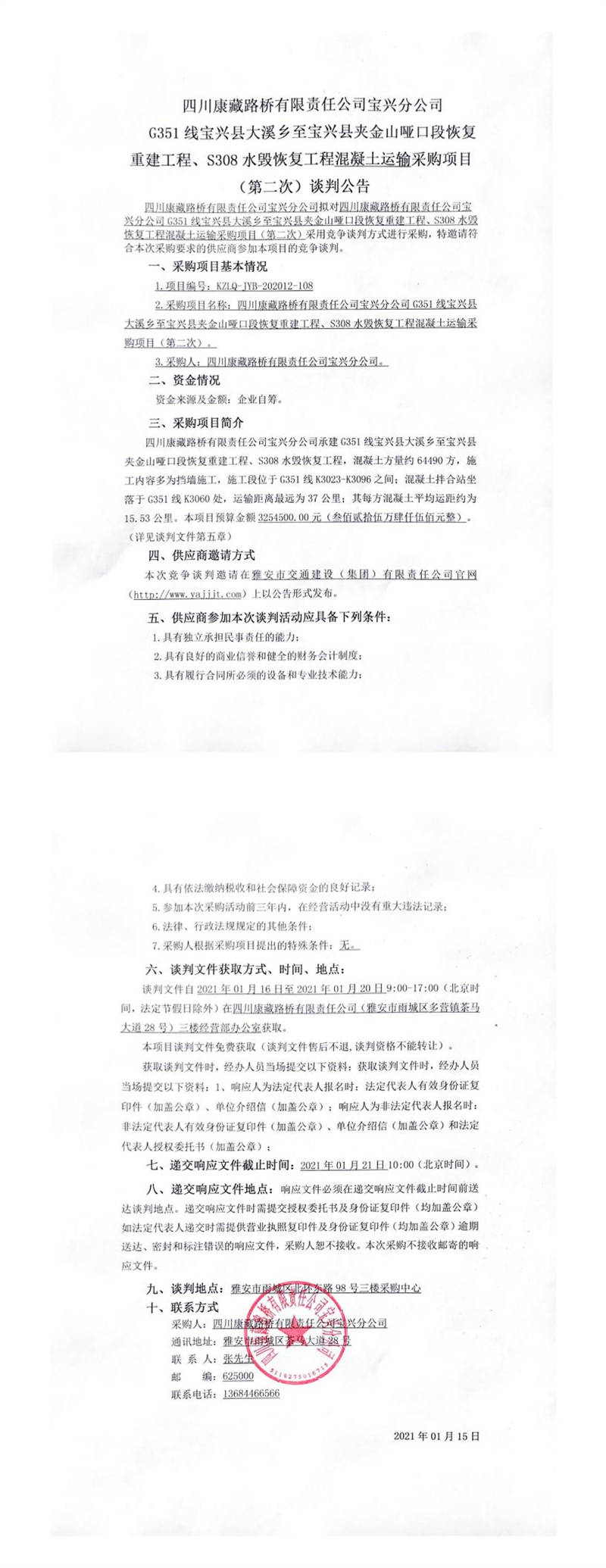 四川康藏路橋有限責任公司寶興分公司G351線寶興縣大溪鄉(xiāng)至寶興縣夾金山啞口段恢復重建工程、S308水毀恢復工程混凝土運輸采購項目(第二次)談判公告