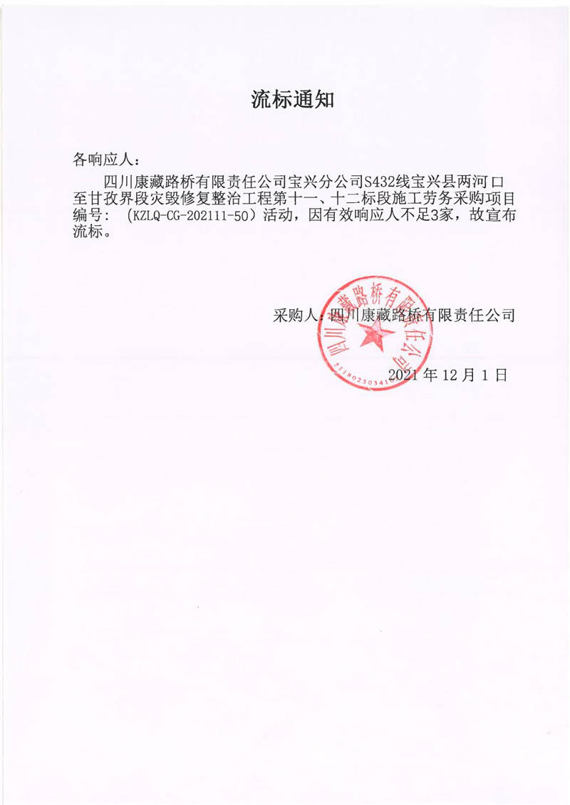 四川康藏路橋有限責(zé)任公司S432線寶興縣兩河口至甘孜界段災(zāi)毀修復(fù)整治工程第十一、十二標(biāo)段施工勞務(wù)采購(gòu)流標(biāo)通知