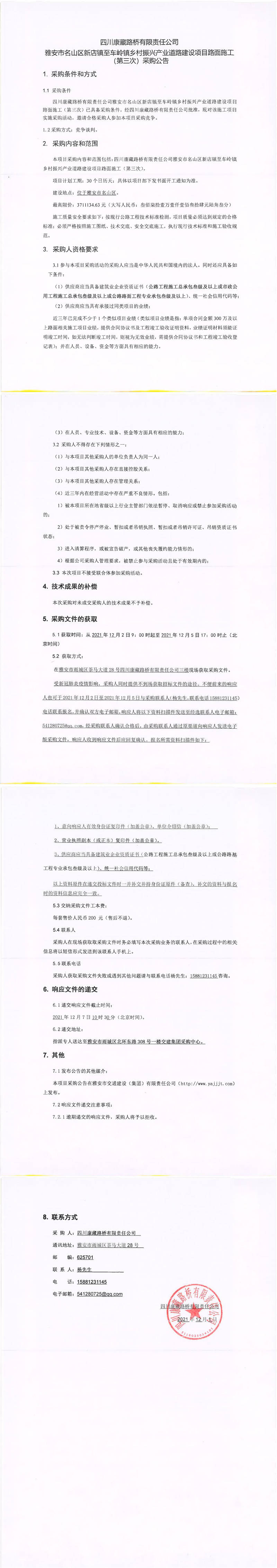 四川康藏路橋有限責(zé)任公司雅安市名山區(qū)新店鎮(zhèn)至車嶺鎮(zhèn)鄉(xiāng)村振興產(chǎn)業(yè)道路建設(shè)項(xiàng)目路面施工(第三次)采購公告
