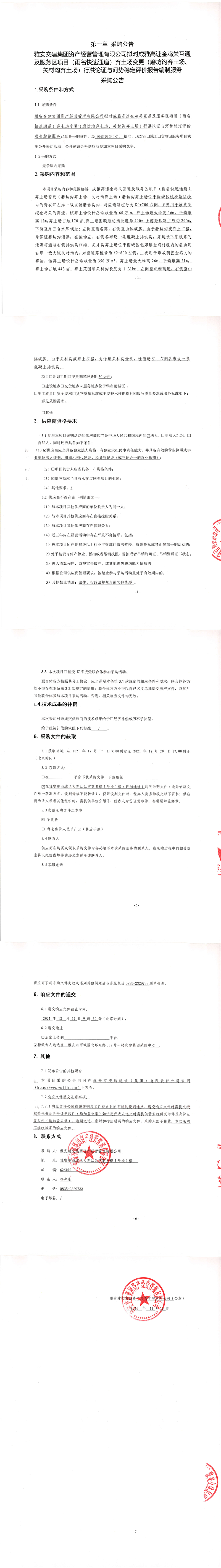 雅安交建集團(tuán)資產(chǎn)經(jīng)營(yíng)管理有限公司擬對(duì)成雅高速金雞關(guān)互通及服務(wù)區(qū)項(xiàng)目(雨名快速通道)棄土場(chǎng)變更(磨坊溝棄土場(chǎng)、關(guān)材溝棄土場(chǎng))行洪論證與河勢(shì)穩(wěn)定評(píng)價(jià)報(bào)告編制服務(wù)采購(gòu)公告