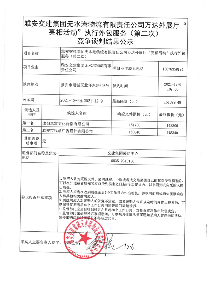 雅安交建集團無水港物流有限責任公司萬達外展廳“亮相活動”執(zhí)行外包服務(第二次)競爭談判結(jié)果公示