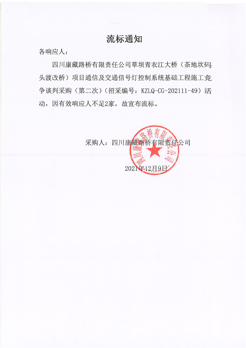 四川康藏路橋有限責任公司草壩青衣江大橋(茶地坎碼頭渡改橋)項目通信及交通信號燈控制系統(tǒng)基礎工程施工競爭談判采購(第二次)流標通知