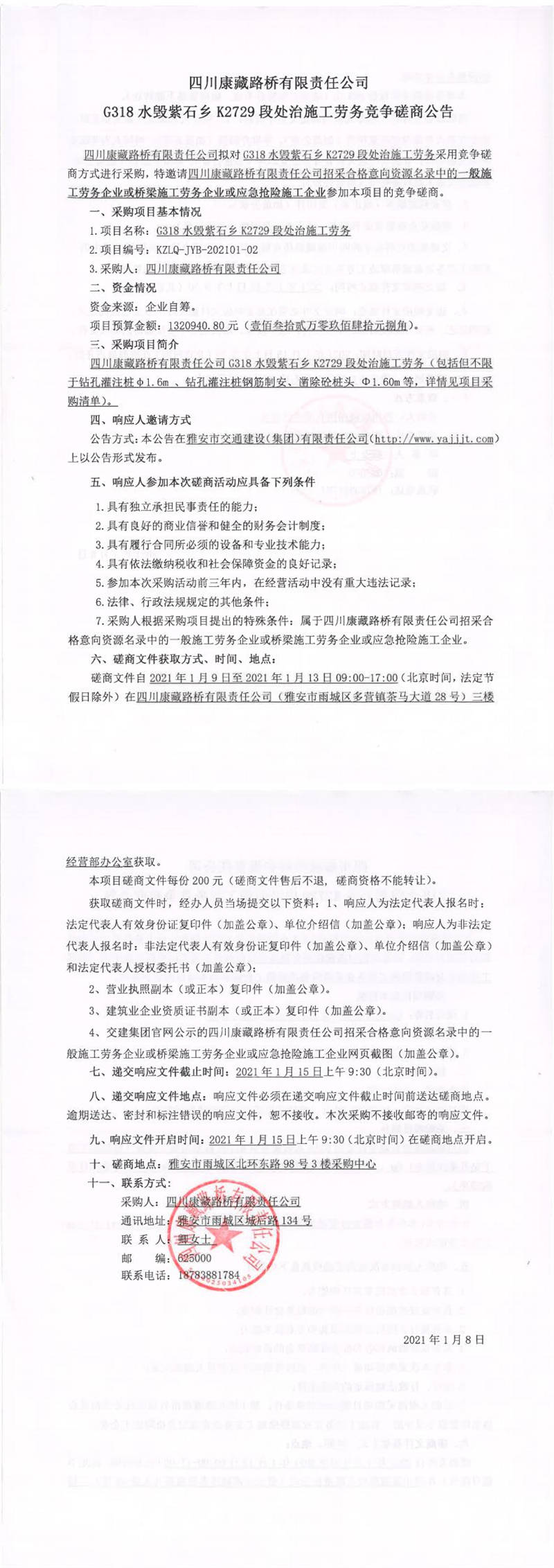 四川康藏路橋有限責任公司G318水毀紫石鄉(xiāng)K2729段處治施工勞務競爭磋商公告