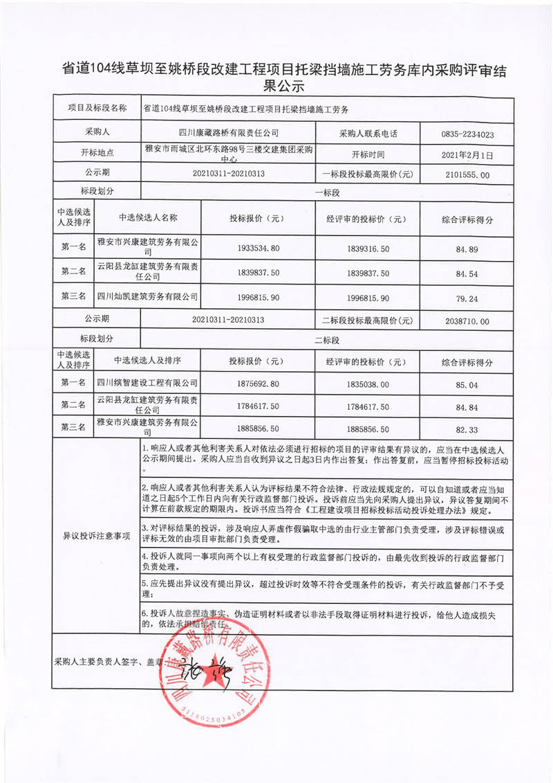 四川康藏路橋有限責任公司省道104線草壩至姚橋段改建工程項目托梁擋墻施工勞務(wù)庫內(nèi)采購評審結(jié)果公示