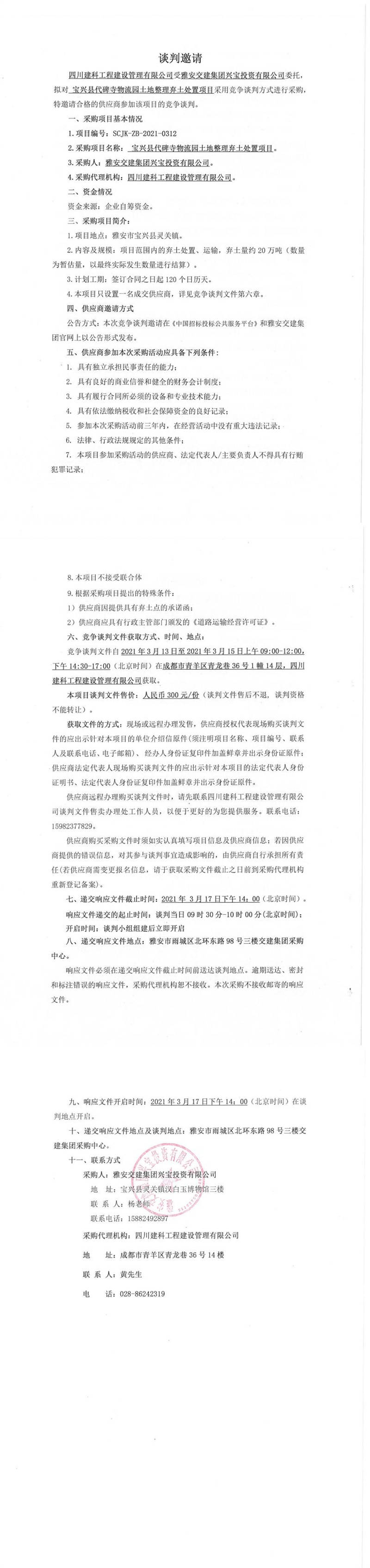 雅安交建集團(tuán)興寶投資有限公司寶興縣代碑寺物流園土地整理棄土處置項目競爭談判公告