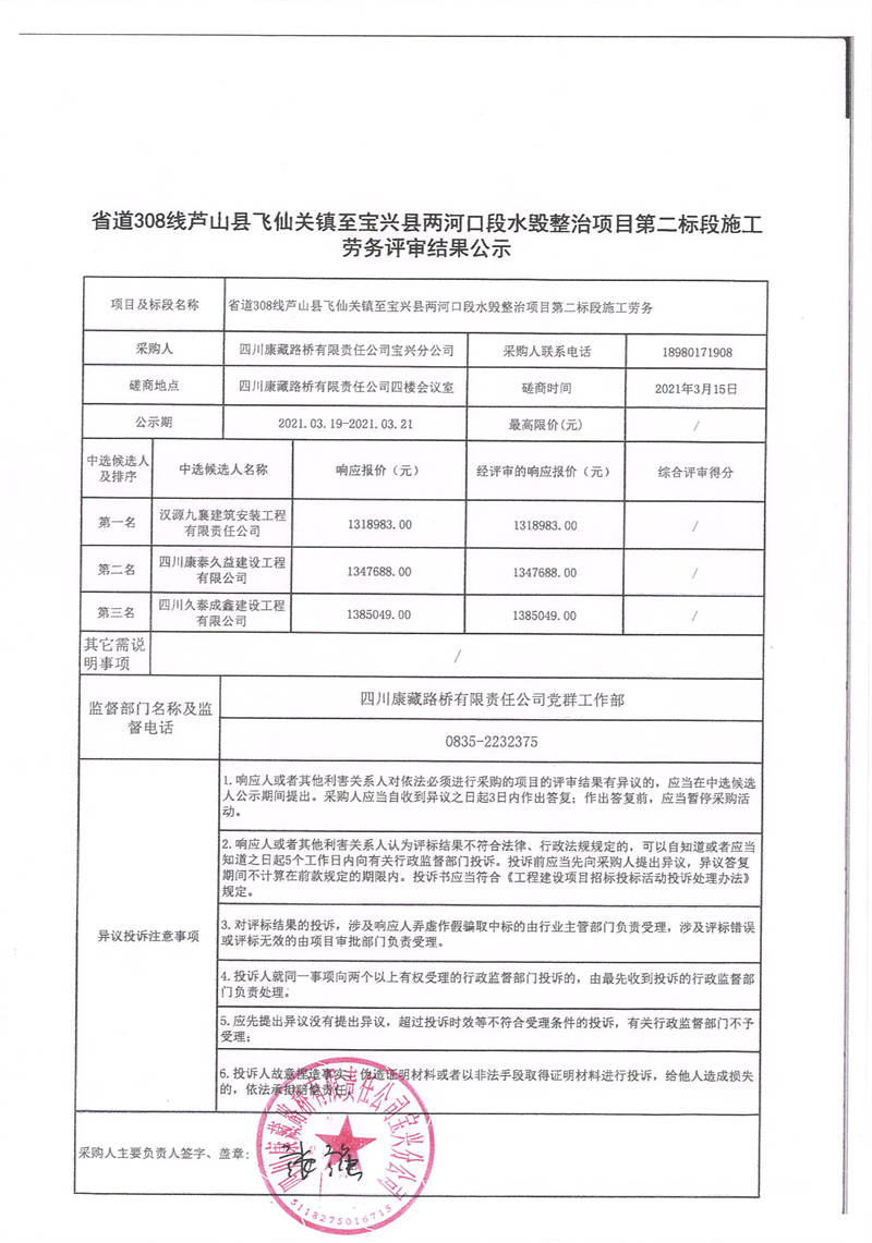 四川康藏路橋有限責任公司寶興分公司省道308線蘆山縣飛仙關鎮(zhèn)至寶興縣兩河口段水毀整治項目第二標段施工勞務評審結(jié)果公示