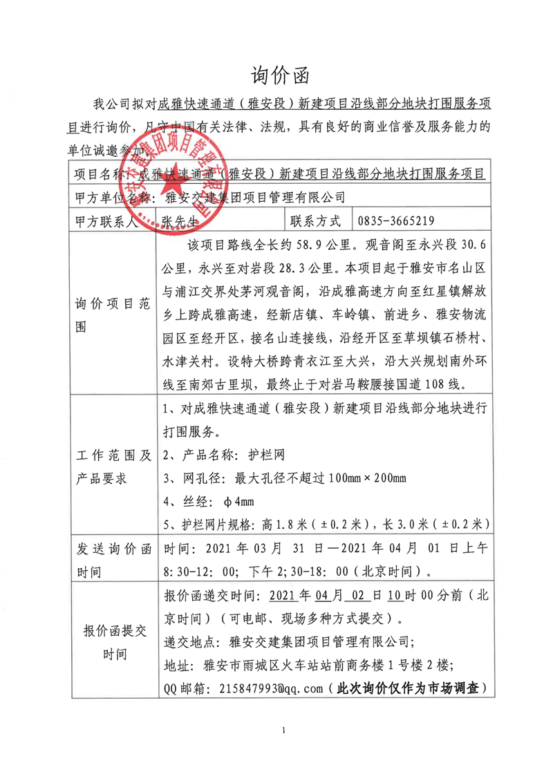 雅安交建集團項目管理有限公司成雅快速通道(雅安段)新建項目沿線部分地塊打圍服務(wù)項目詢價函