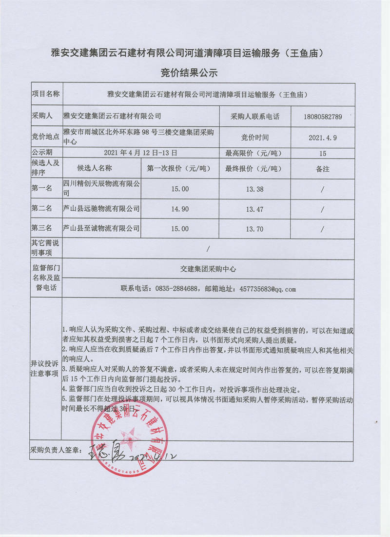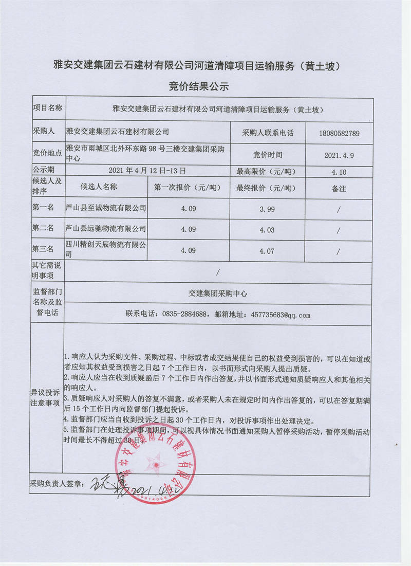 雅安交建集團(tuán)云石建材有限公司河道清障項目運(yùn)輸服務(wù)競價結(jié)果公示