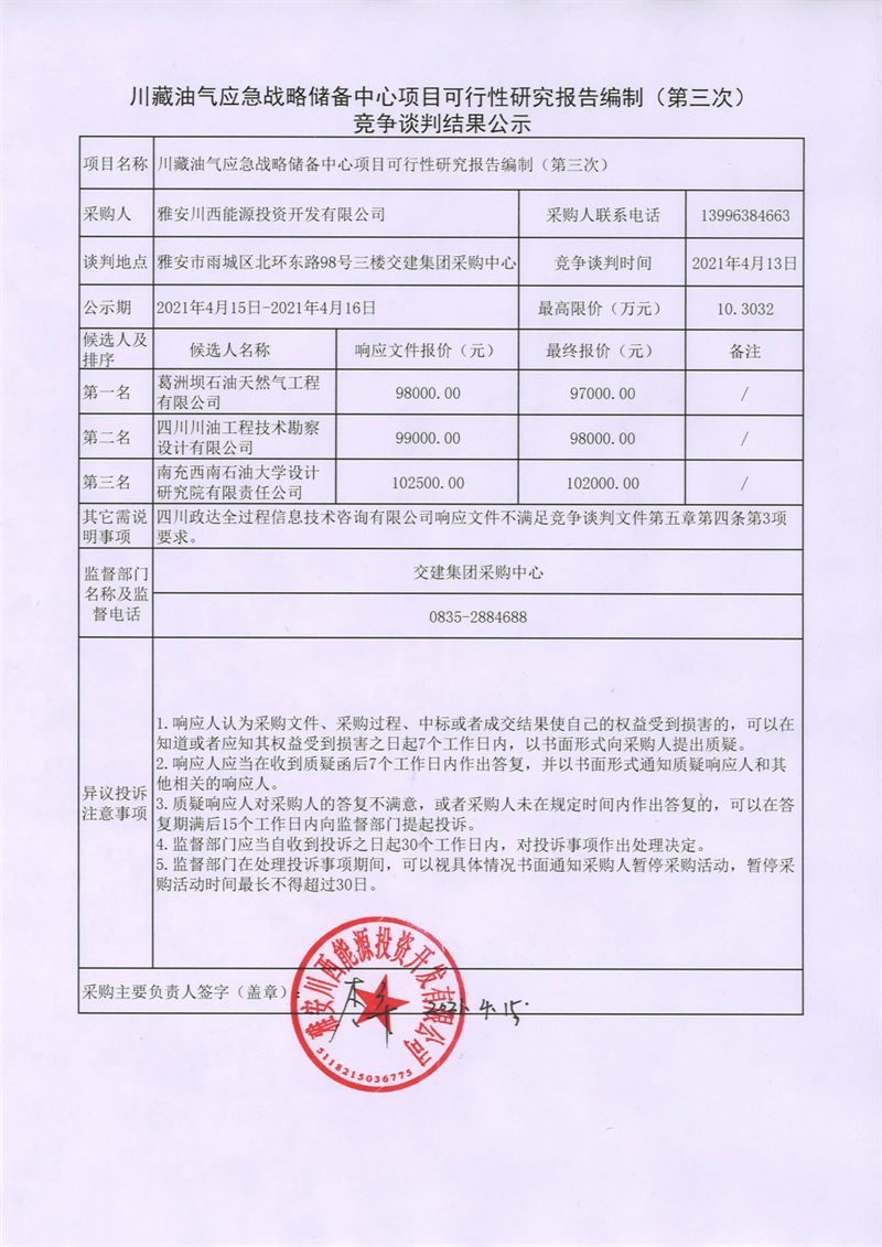 雅安川西能源投資開發(fā)有限公司川藏油氣應急戰(zhàn)略儲備中心項目可行性研究報告編制 (第三次)競爭談判結(jié)果公示