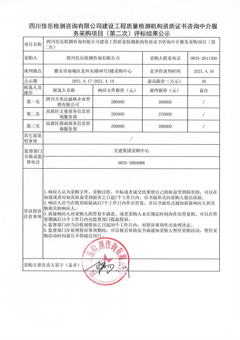 四川佳岳檢測咨詢有限公司建設(shè)工程質(zhì)量檢測機(jī)構(gòu)資質(zhì)證書咨詢中介服務(wù)采購項(xiàng)目(第二次)評標(biāo)結(jié)果公示