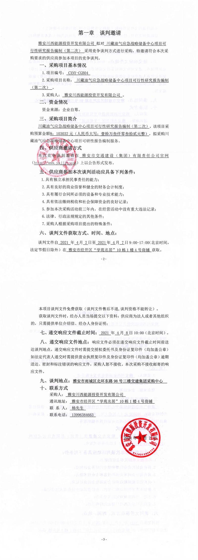 雅安川西能源投資開(kāi)發(fā)有限公司川藏油氣應(yīng)急戰(zhàn)略?xún)?chǔ)備中心項(xiàng)目可行性研究報(bào)告編制(第二次)競(jìng)爭(zhēng)談判公告