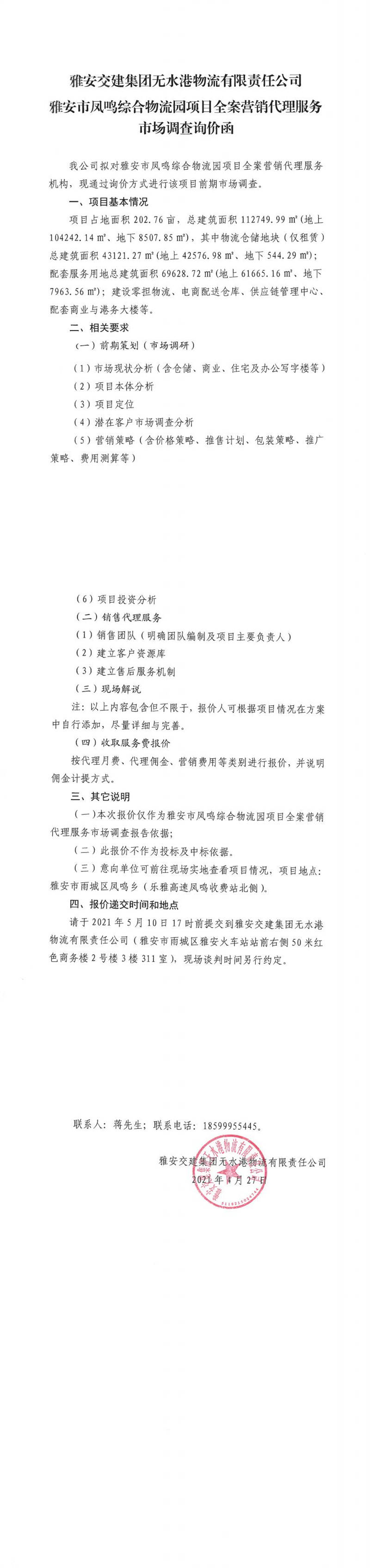 雅安交建集團(tuán)無水港物流有限責(zé)任公司雅安市鳳鳴綜合物流園項(xiàng)目全案營銷代理服務(wù)市場調(diào)查詢價函