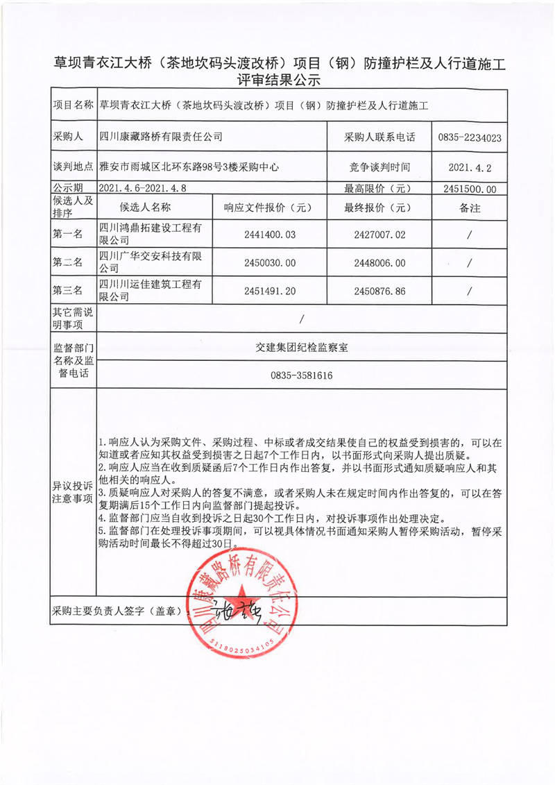 四川康藏路橋有限責(zé)任公司草壩青衣江大橋(茶地坎碼頭渡改橋)項目(鋼)防撞護欄及人行道施工評審結(jié)果公示